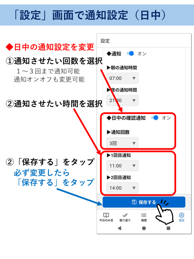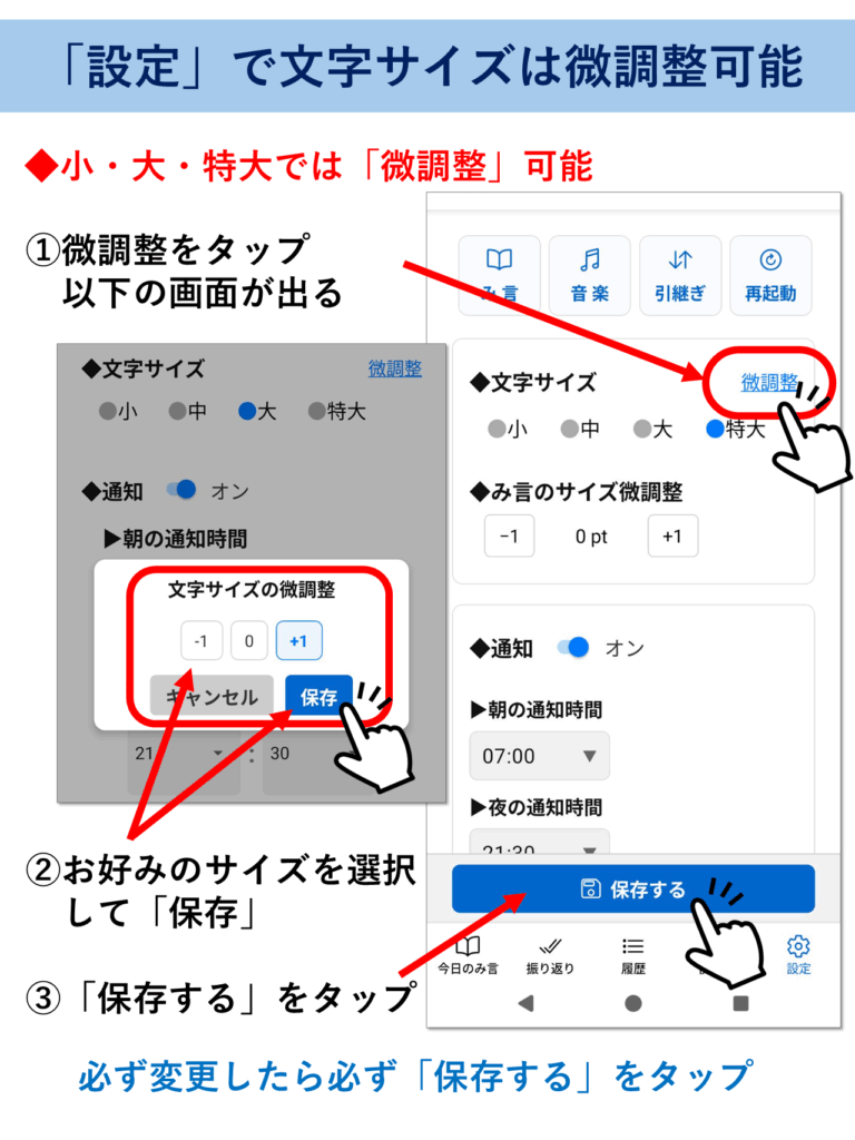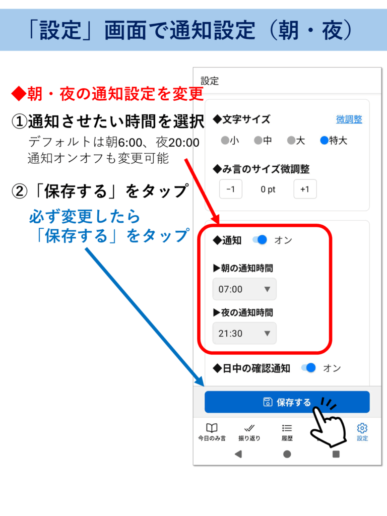 1-2 最初に設定すること(文字サイズの変更と通知設定) 最初に設定すること(文字サイズの変更と通知設定) ※このページはピンチ(指2本で拡大・縮小)対応です。解説画像が見にくい場合は拡大してご覧ください。 ▶をタップすると中身が見れます(▼をタップで元に戻る) 文字サイズの変更 通知設定