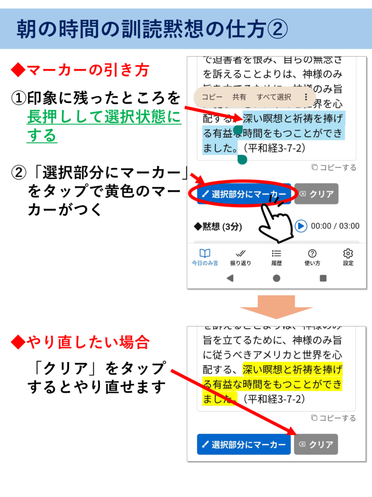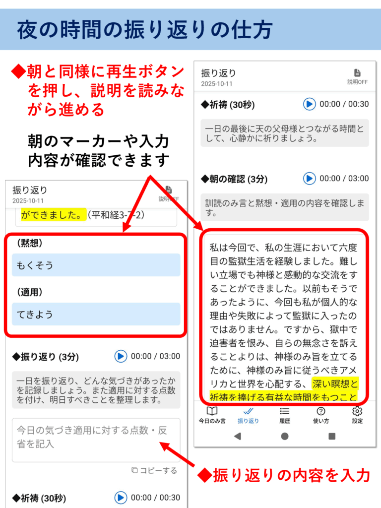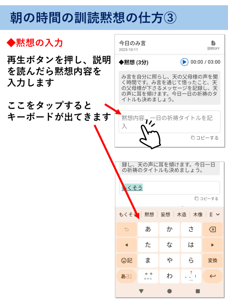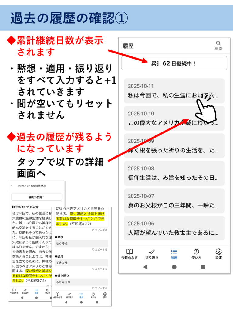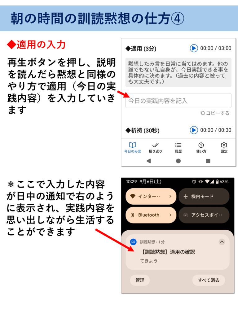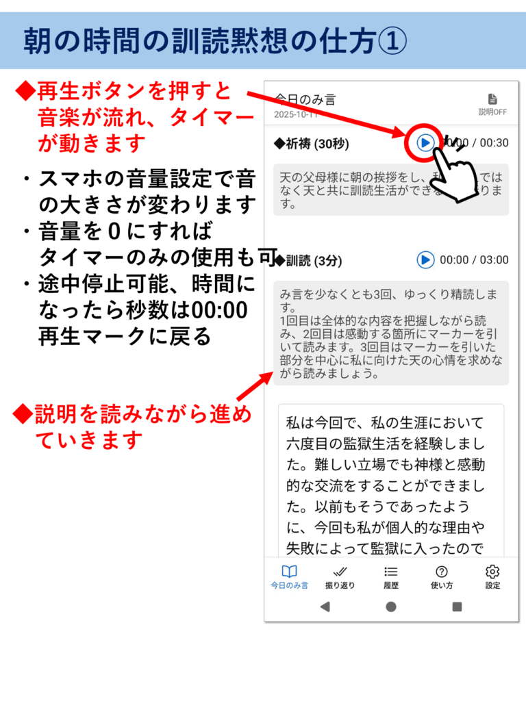 アプリの使い方 ※このページはピンチ(指2本で拡大・縮小)対応です。解説画像が見にくい場合は拡大してご覧ください。 ▶をタップすると中身が見れます(▼をタップで元に戻る) 朝の訓読黙想の仕方 夜の振り返りの仕方 過去の履歴の確認 アプリの動作がおかしい時